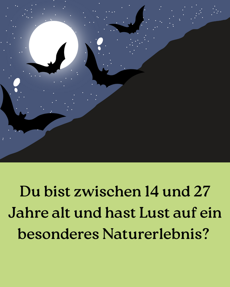 Du bist zwischen 14 und 27 Jahre alt und hast Lust auf ein besonderes Naturerlebnis? Dann komm mit auf unsere Fledermauswanderung und entdecke die geheimnisvolle Welt der nachtaktiven Jäger!
